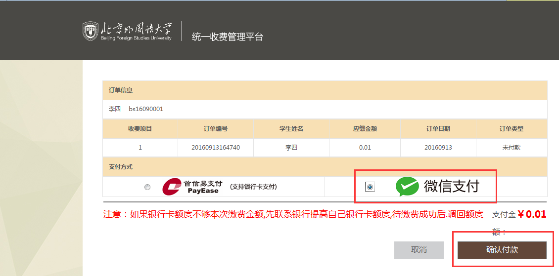 选择支付方式:首信易支付、微信支付等,然后点击【确认支付】;