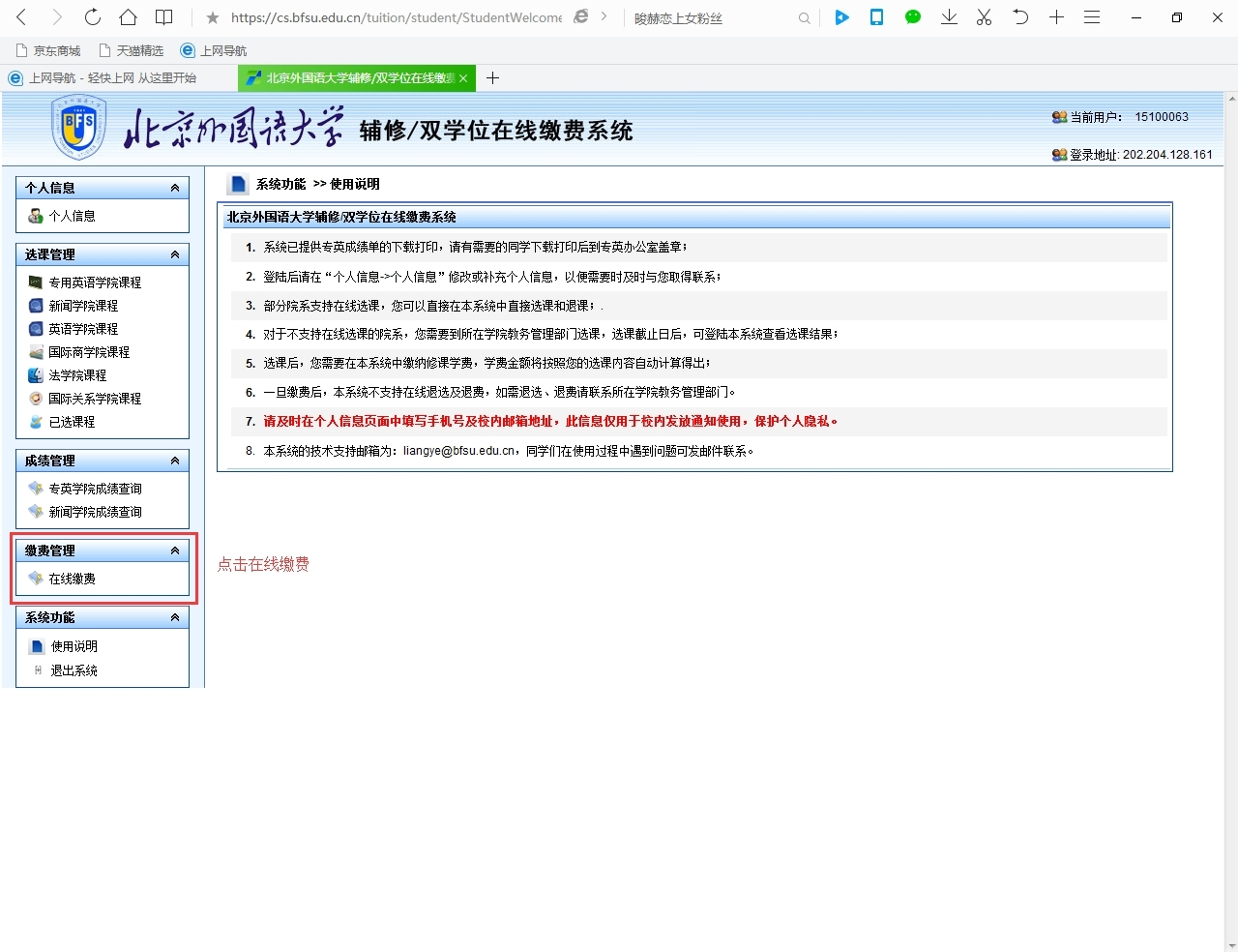 同学们在交纳学费前,请务必确认本人已选课程信息及对应应收款金额,如有疑问请将问题发往计算机系梁野老师邮箱:liangye@bfsu.edu.cn。