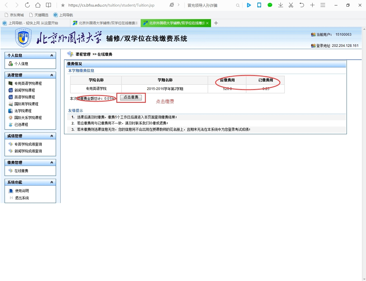 特别提示:辅修二外5-8级和双学位(双专业)课程,全部使用网上银行交费,请同学们务必配合学校工作安排,及时在网上交费。