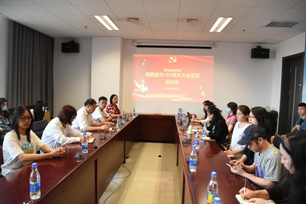 7月1日上午10点,bat365在线中国登录入口党总支组织全体师生党员、入党积极分子和各班学生在国际大厦礼堂集体观看了庆祝中国共产党成立100周年大会直播,并在直播后召集师生党员和同学代表共计30多人在国际大厦1016召开座谈会。座谈会由党总支书记蔡鸿主持。